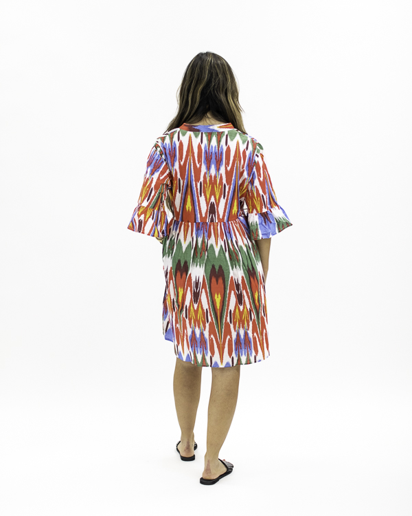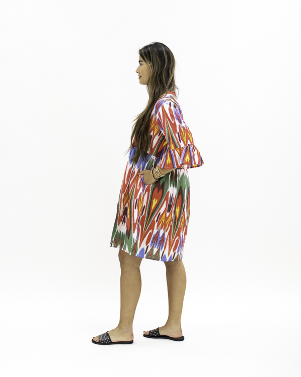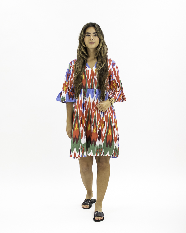 Nice to know: Deze HOLOMI jurk is gemaakt van Ikat. Ikat is een techniek waarmee het textiel van motieven voorzien wordt. Voordat het garen geweven wordt, verven we het eerst. Sommige delen worden geverfd en samengebonden óf we bedekken ze juist met een waterafstotende stof (zoals was) zodat de kleurstoffen zich op die plaatsen niet kunnen hechten. Een arbeidsintensief karweitje maar HOLIMOLI prachtig! We hebben het al eerder gezegd, beautiful things take time. Met liefde en aandacht voor het ambacht maken we voor jou de allermooiste fashion.